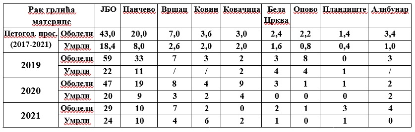 Tabela: Distribucija broja obolelih i umrlih od karcinoma grlića materice po opštinama Južnobanatskog okruga u periodu od 2019-2021. godine i petogodišnji prosek obolevanja i umiranja