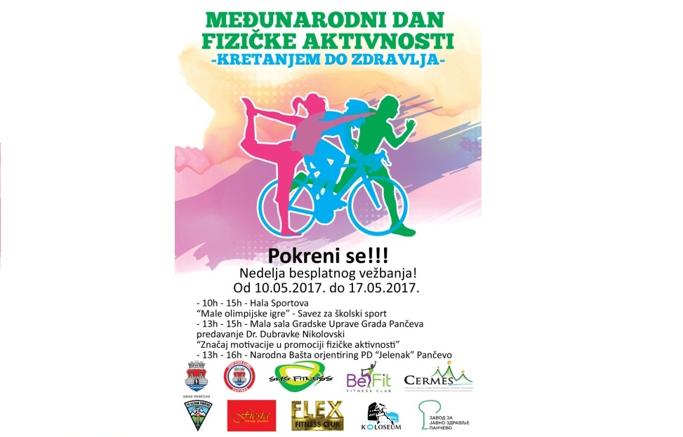 Завод за јавно здравље Панчево ће у сарадњи са Градском управом града Панчева, Спортским савезом Панчево, Савезом за школски спорт Панчево, ПУ „Дечја радост“ Панчево, ЦЕРМЕС, панчевачком подружницом ДЛВ-СЛД, ПД «Јеленак» и фитнес центрима и ове године обележити Међународни дан физичке активности 10. мај 2017. године низом дешавања у граду према доле наведеном програму.
