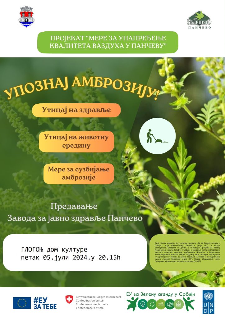 У оквиру пројекта  „Мере за унапређење квалитета ваздуха у Панчеву“  у току је кампања за  информисање грађанства о амброзији као алергену и безбедним начинима њеног уклањања са приватног земљишта. Позивамо на презентације које ће се одвијати данас по следећем распореду: